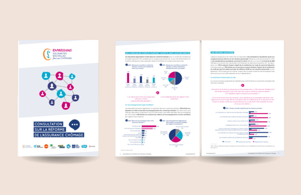 - Organisation d’une consultation nationale sur le chômage et ses impacts avec les différents partenaires du collectif : animation des groupes de travail, rédaction du questionnaire, traitement des résultats, interviews de personne au chômage, production des outils de communication liés à la campagne